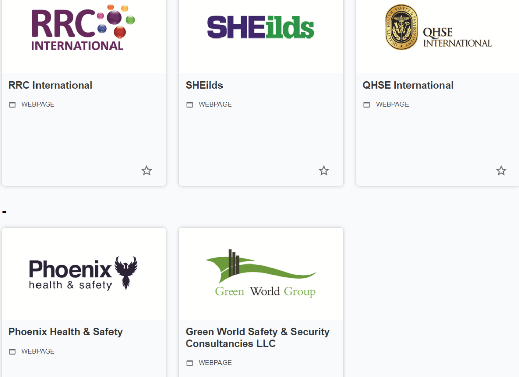 Green World Safety & Security Consultancies LLC, Phoenix Health & Safety, QHSE International, RRC International et SHEilds.