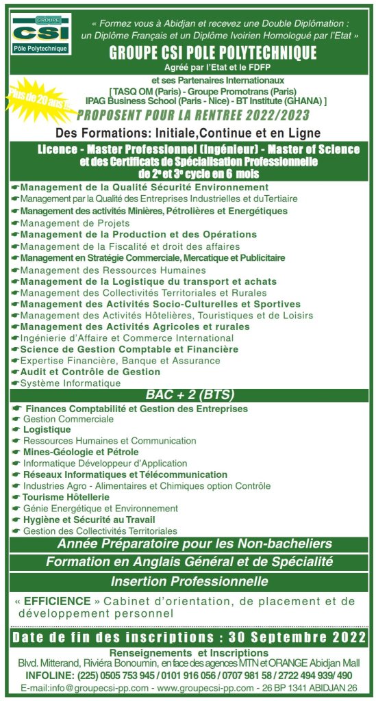Le docteur Aby Raoul, PDG du groupe CSI POLE POLYTECHNIQUE, a rappelé que le CSI POLE POLYTECHNIQUE a été le premier a formé en management de la qualité. Donc chers professionnels de la Qualité, l’Hygiène, la Sécurité , de l’Environnement et du Développement Durable (QHSE-DD) et étudiants qui veulent intégrer ce domaine , inscrivez vous au CSI car il y’a toutes sortes de diplômes dans ce domaine. Voyez la plaquette ci-dessous:
