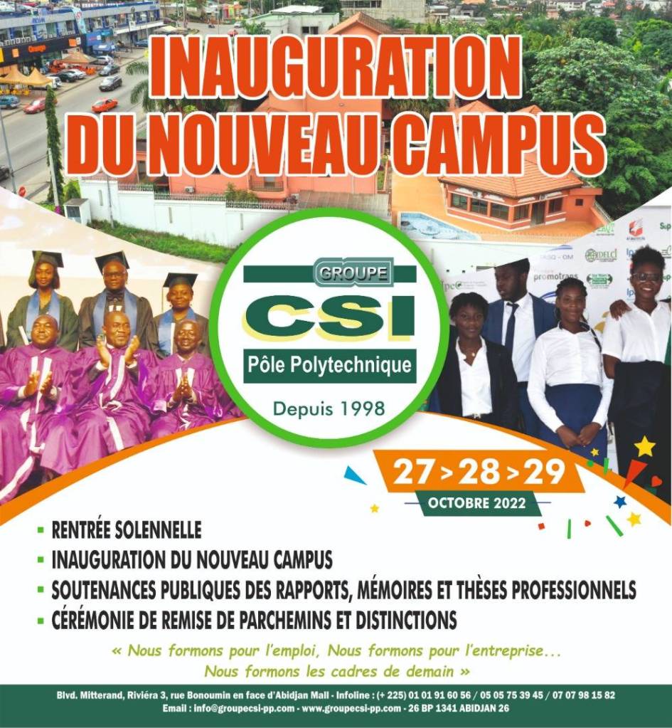 Le 29 Octobre 2022 , le CSI POLE POLYTECHNIQUE a procédé à une remise de parchemins à ses diplômés. Cette cérémonie est venu clôturer la série d’évènements pour l’inauguration du nouveau campus du groupe. Ces évènements se sont déroulés du 27 au 29 Octobre 2022 avec :