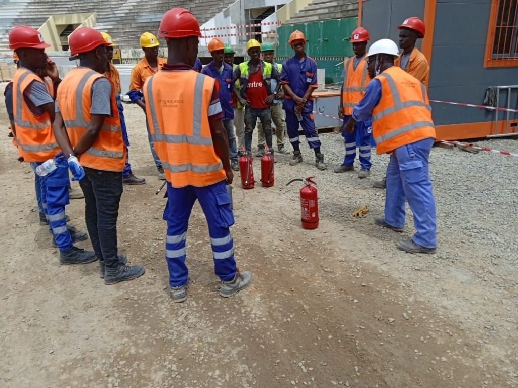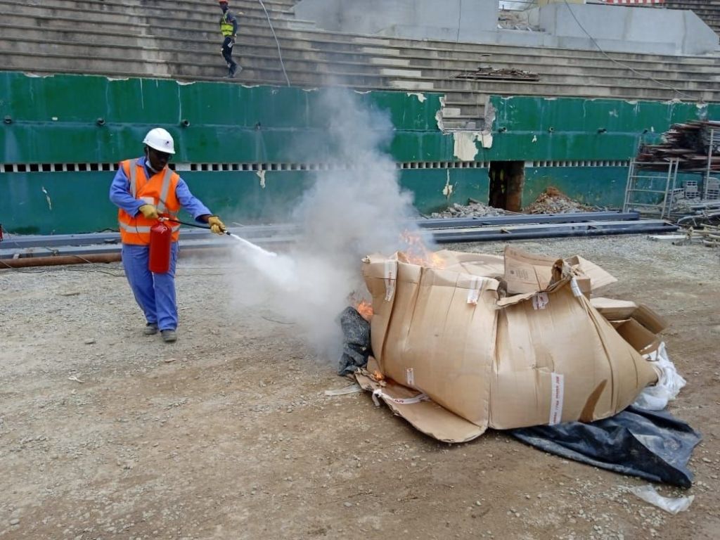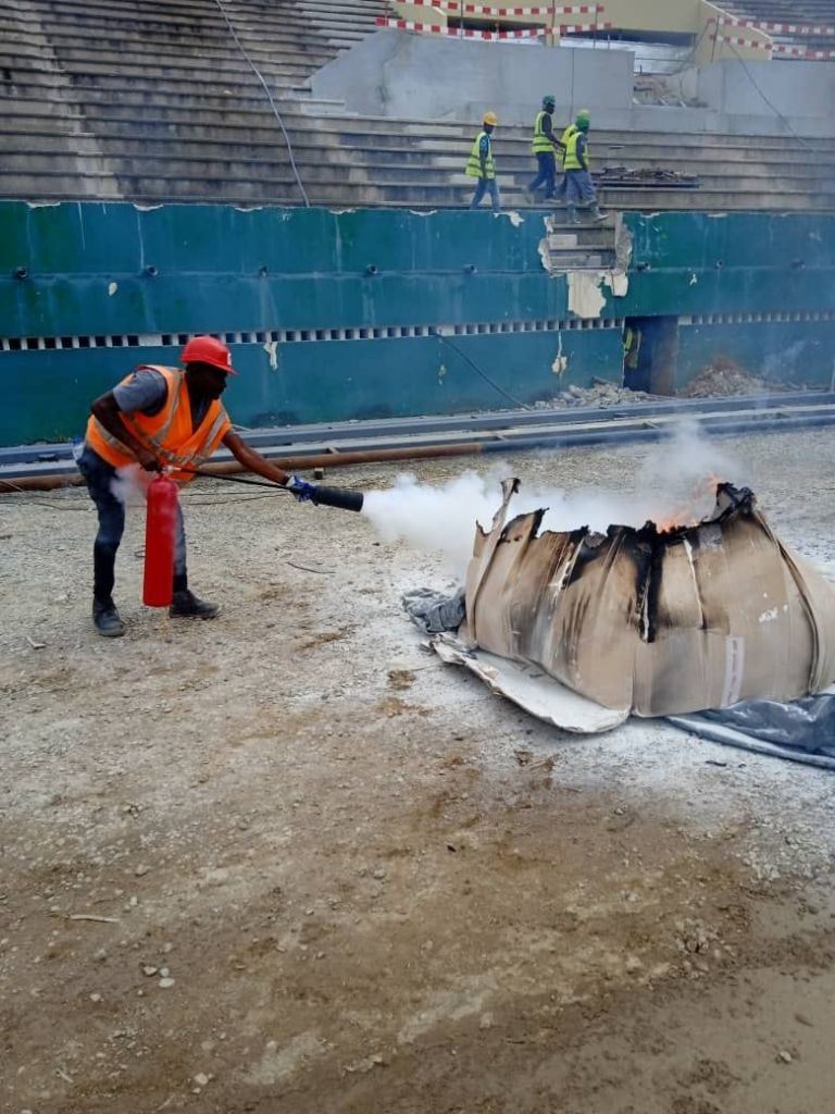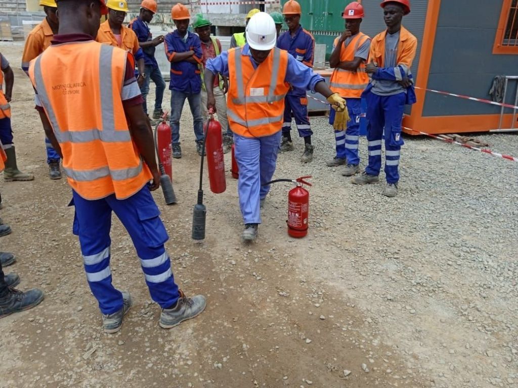 « C’est avec une immense joie que j’ai donné une formation à nos Relais SHE et Operateurs de machine à l’ utilisation des Équipements de Première Intervention( Extincteur à poudre ABC et CO2) de lutte contre l’incendie sur notre chantier STADE FELIX HOUPHOUET BOIGNY . Savoir utiliser ses EPI est très important en cas de départ de feu. voilà pourquoi nous les avons utilisé sur un cas de feu réel. »